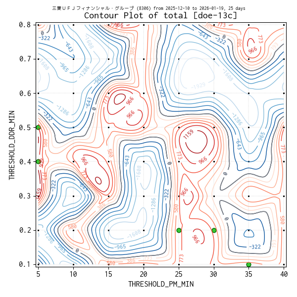 対象のティックデータを補間した等高線図を作成しています。実験点は ・、平均損益トップ 5 の条件は 🟢、平均損益がマイナスになった条件があれば ✖ で表示しています。