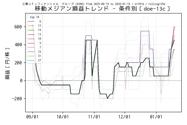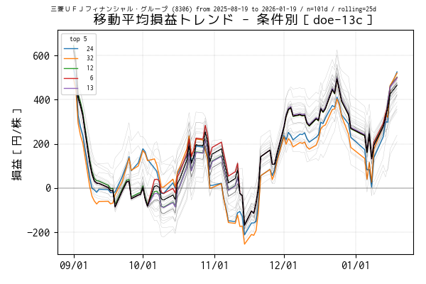 最後の営業日(当営業日)までを集計した移動平均損益でトップ 5 の条件は色を変えてプロットしています。一方、移動平均損益がマイナスになっている条件は黒の実線、その他は薄墨色でプロットしています。