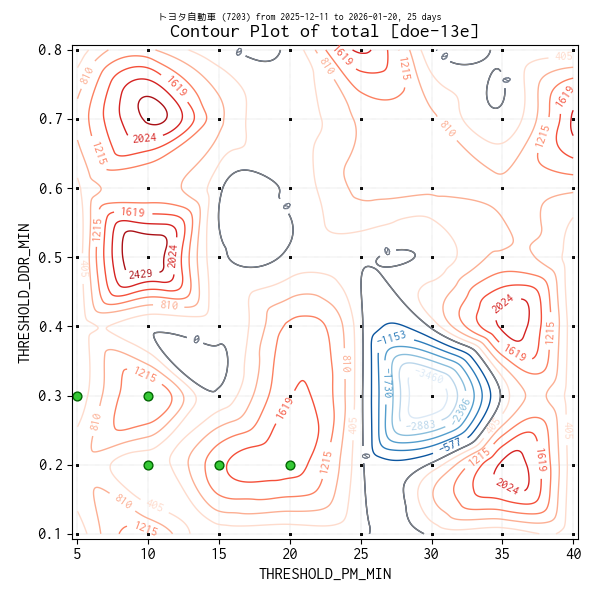 対象のティックデータを補間した等高線図を作成しています。実験点は ・、平均損益トップ 5 の条件は 🟢、平均損益がマイナスになった条件があれば ✖ で表示しています。