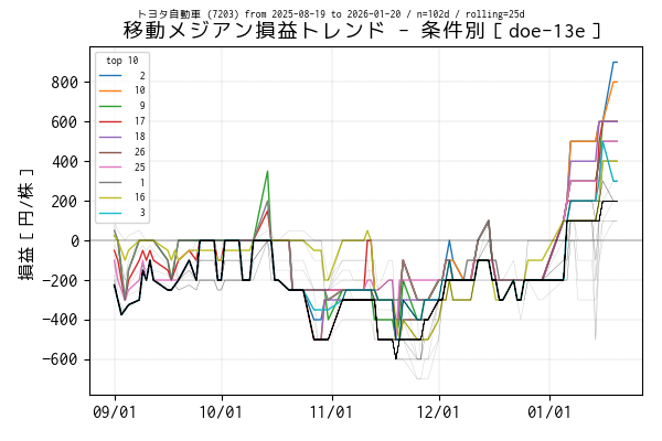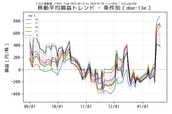 最後の営業日(当営業日)までを集計した移動平均損益でトップ 5 の条件は色を変えてプロットしています。一方、移動平均損益がマイナスになっている条件は黒の実線、その他は薄墨色でプロットしています。