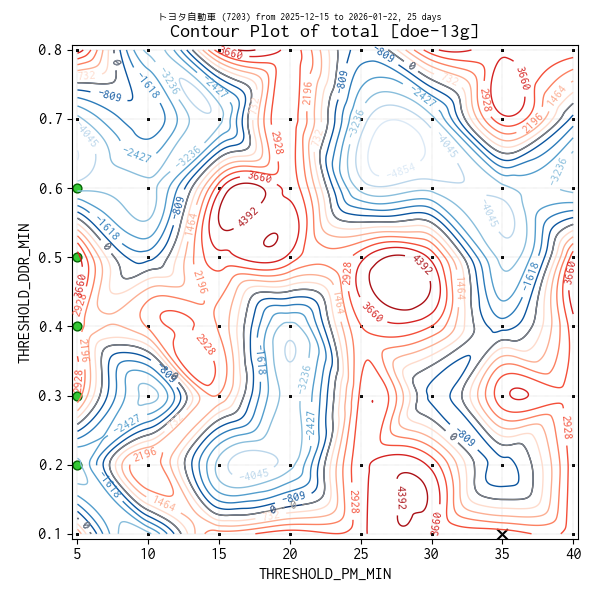 対象のティックデータを補間した等高線図を作成しています。実験点は ・、平均損益トップ 5 の条件は 🟢、平均損益がマイナスになった条件があれば ✖ で表示しています。