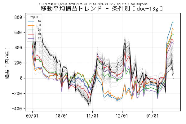最後の営業日(当営業日)までを集計した移動平均損益でトップ 5 の条件は色を変えてプロットしています。一方、移動平均損益がマイナスになっている条件は黒の実線、その他は薄墨色でプロットしています。