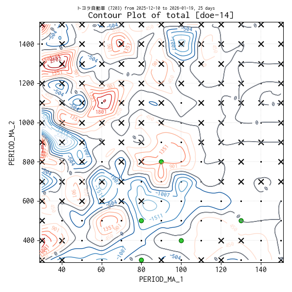 対象のティックデータを補間した等高線図を作成しています。実験点は ・、平均損益トップ 5 の条件は 🟢、平均損益がマイナスになった条件があれば ✖ で表示しています。