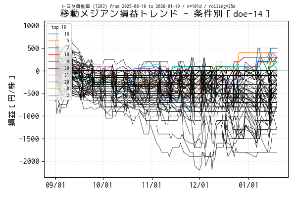 実験条件別の移動メジアン損益トレンド(データは当営業日まで)