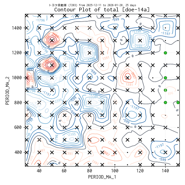 対象のティックデータを補間した等高線図を作成しています。実験点は ・、平均損益トップ 5 の条件は 🟢、平均損益がマイナスになった条件があれば ✖ で表示しています。