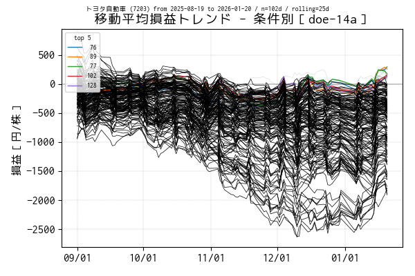 最後の営業日(当営業日)までを集計した移動平均損益でトップ 5 の条件は色を変えてプロットしています。一方、移動平均損益がマイナスになっている条件は黒の実線、その他は薄墨色でプロットしています。