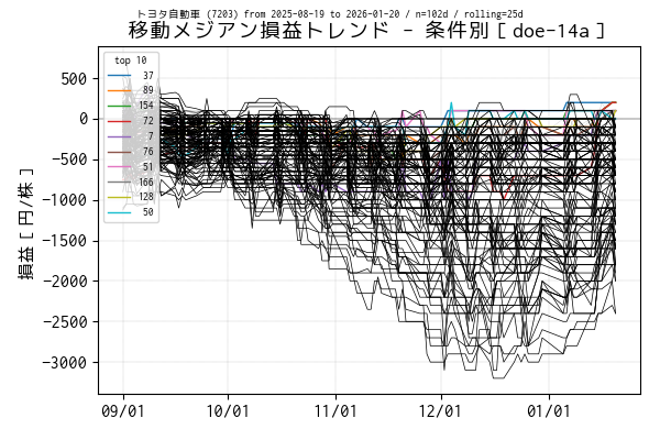 実験条件別の移動メジアン損益トレンド(データは当営業日まで)