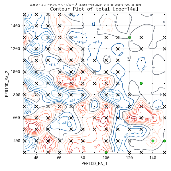 対象のティックデータを補間した等高線図を作成しています。実験点は ・、平均損益トップ 5 の条件は 🟢、平均損益がマイナスになった条件があれば ✖ で表示しています。