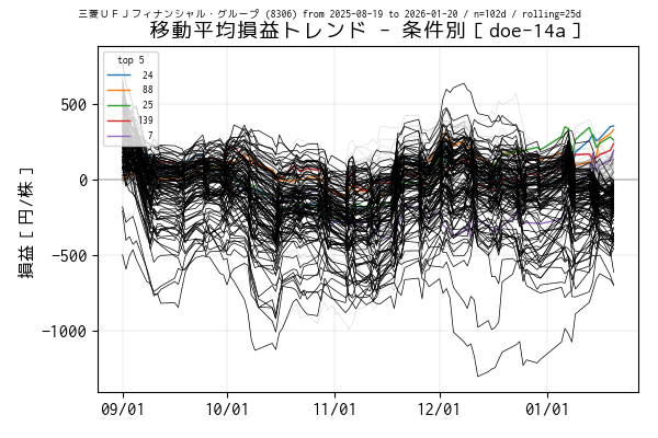 最後の営業日(当営業日)までを集計した移動平均損益でトップ 5 の条件は色を変えてプロットしています。一方、移動平均損益がマイナスになっている条件は黒の実線、その他は薄墨色でプロットしています。