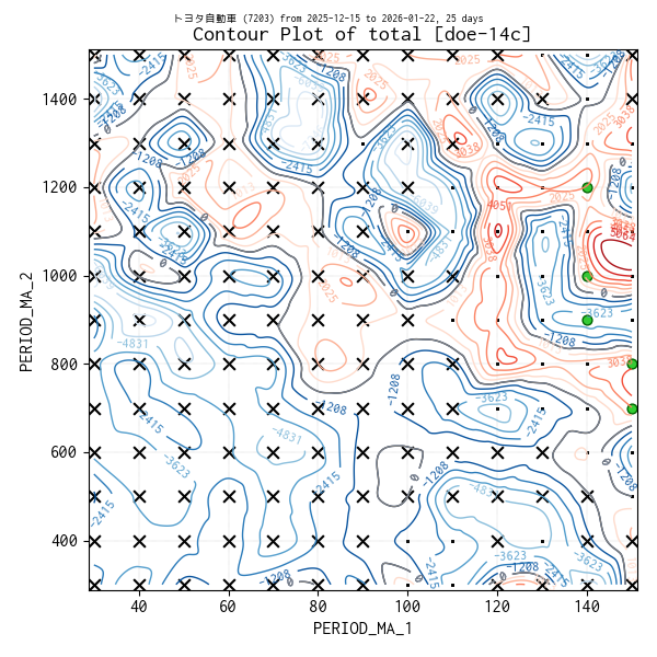 対象のティックデータを補間した等高線図を作成しています。実験点は ・、平均損益トップ 5 の条件は 🟢、平均損益がマイナスになった条件があれば ✖ で表示しています。