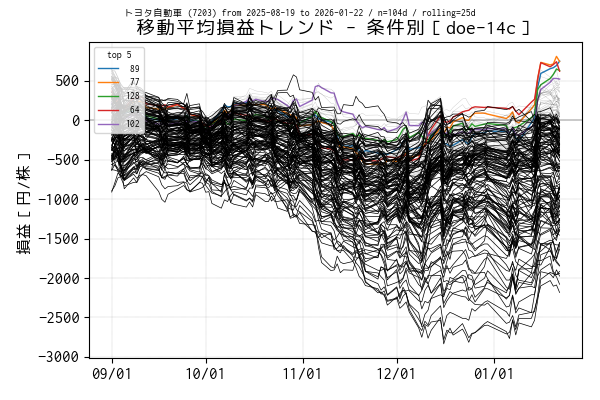 最後の営業日(当営業日)までを集計した移動平均損益でトップ 5 の条件は色を変えてプロットしています。一方、移動平均損益がマイナスになっている条件は黒の実線、その他は薄墨色でプロットしています。