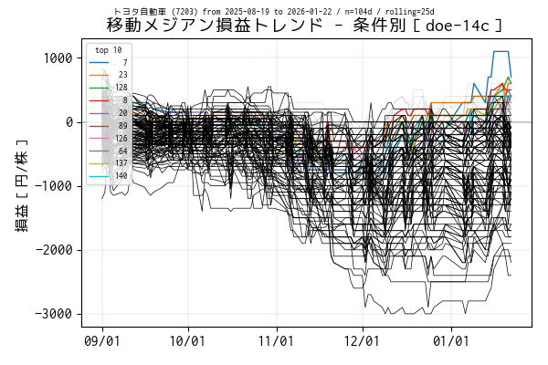 実験条件別の移動メジアン損益トレンド(データは当営業日まで)