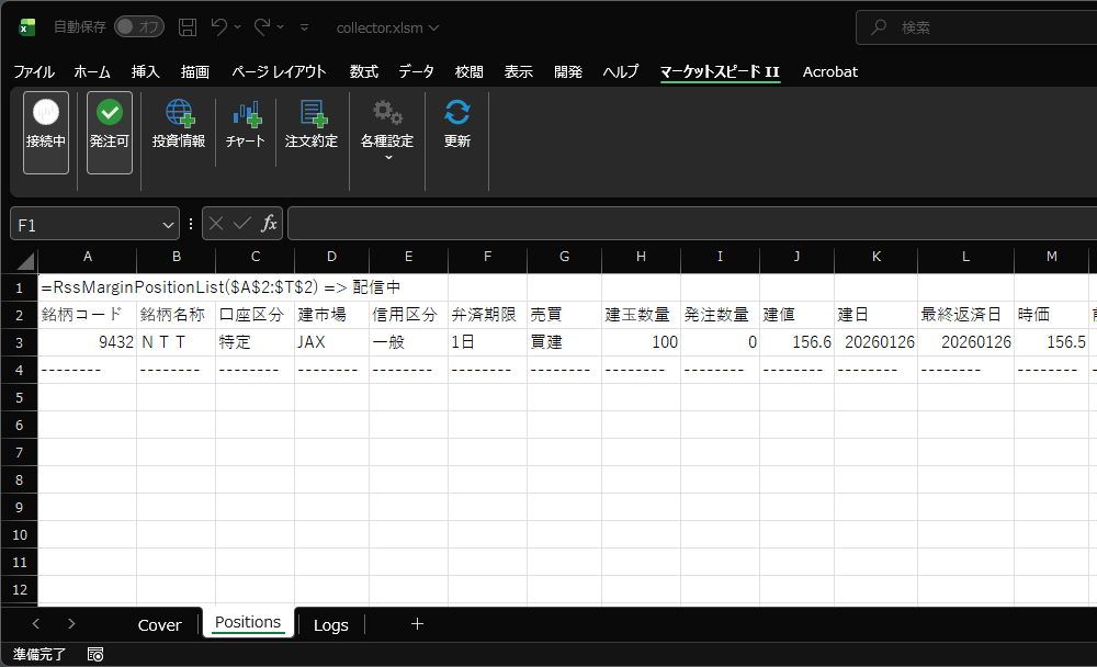 「Positions」シートに、RSS のワークシート関数 RssMarginPositionList で信用建玉一覧を表示しています。