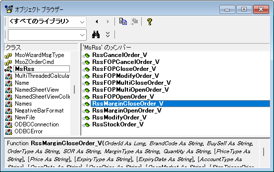 今回利用する RSS の VBA 関数は、信用売買で建玉の新規売買 RssMarginOpenOrder_V と返済 RssMarginCloseOrder_V の 2 つです。