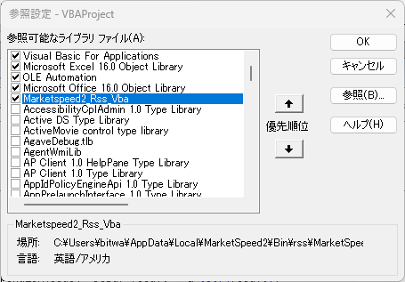 VBA で、RSS の VBA 用関数をできるようにするため、Visual Basic Editor の画面上のツールバーから、「ツール(T)」→「参照設定(R)...」で参照設定のダイアログ画面を表示して、□ Marketspeed_Rss_Vba にチェックを入れます。